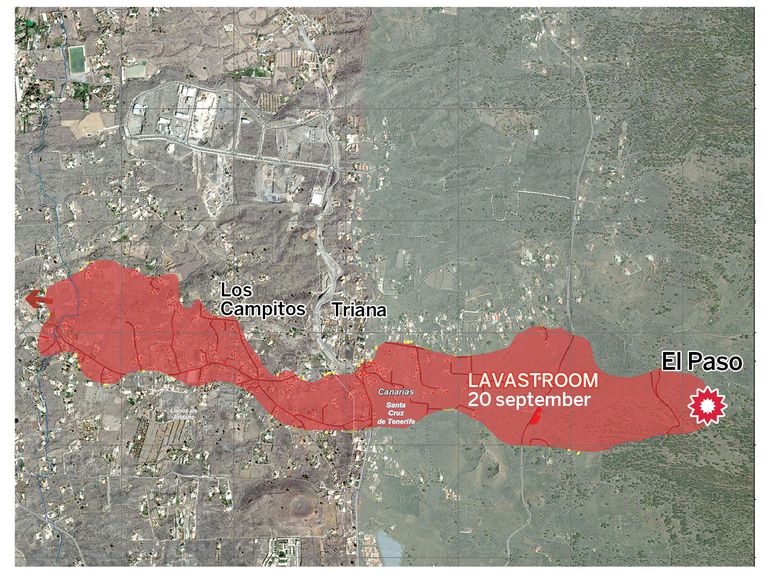 Lava from a volcano eruption flows on the island of La Palma in the Canaries Spain AP A police officer orders journalists to leave the area during a media tour near the volcano on the island of. La Palma eruption. Op het kaartje in rode stippellijnen de mogelijke route van de lava met een snelheid zo snel als een mens loopt.